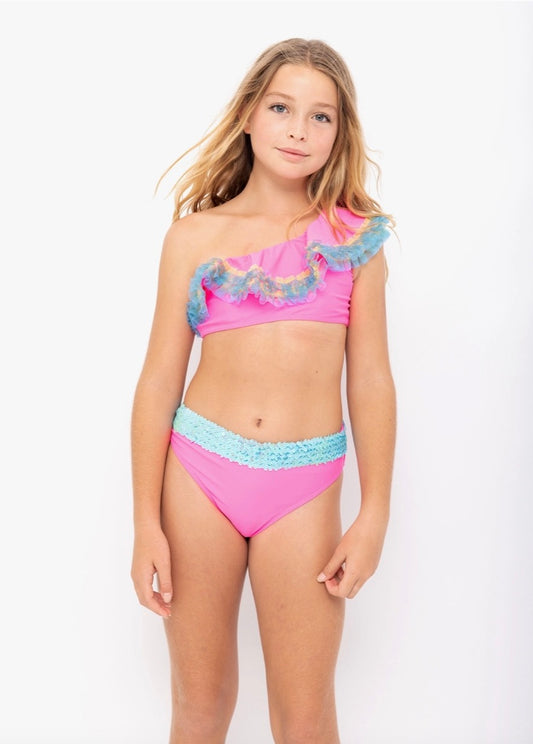 Neon Pink One Shoulder Bikini with Anemone Fringe & Aqua Sequins