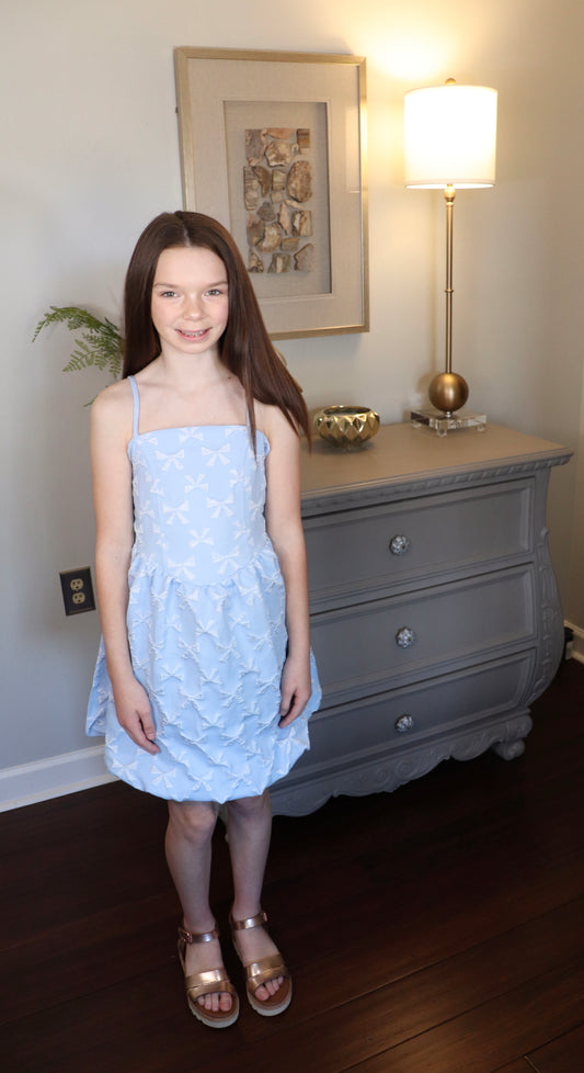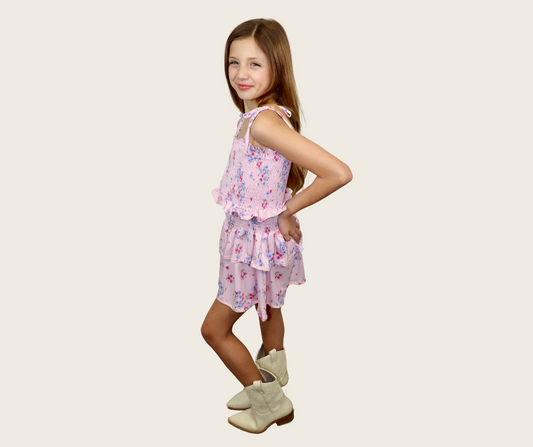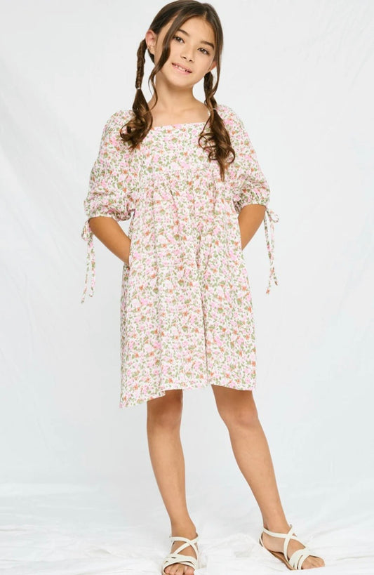 Girls Tie Sleeve Square Neck Floral Tunic Dress