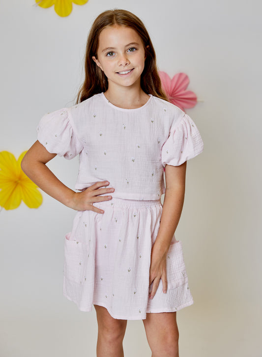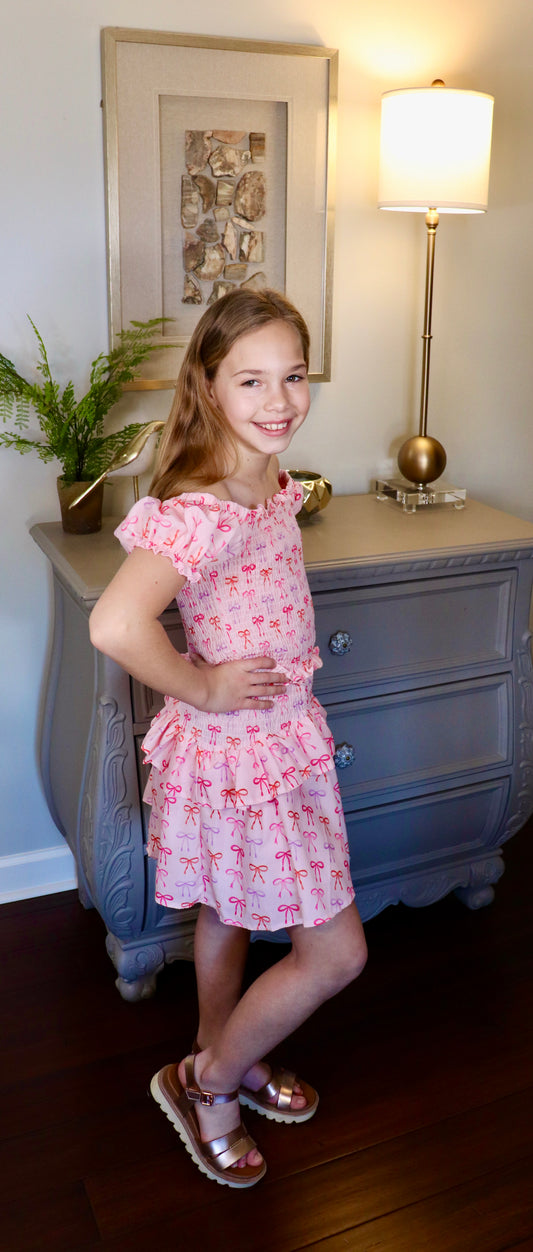 BOW PRINT SMOCKED TOP AND SKIRT SET