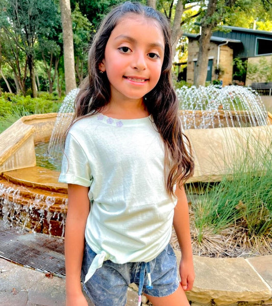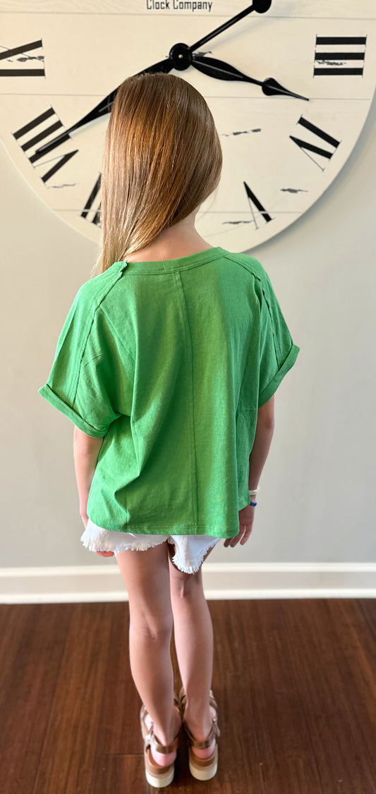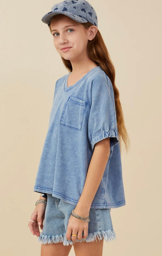 Girls Garment Washed V Neck Elastic Sleeve T Shirt