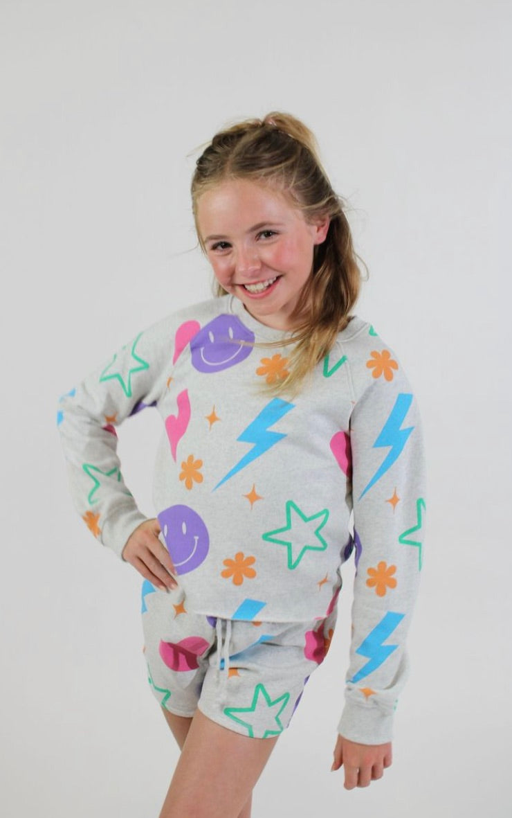 Tween girls fleece shorts featuring multiple icons print all over it.